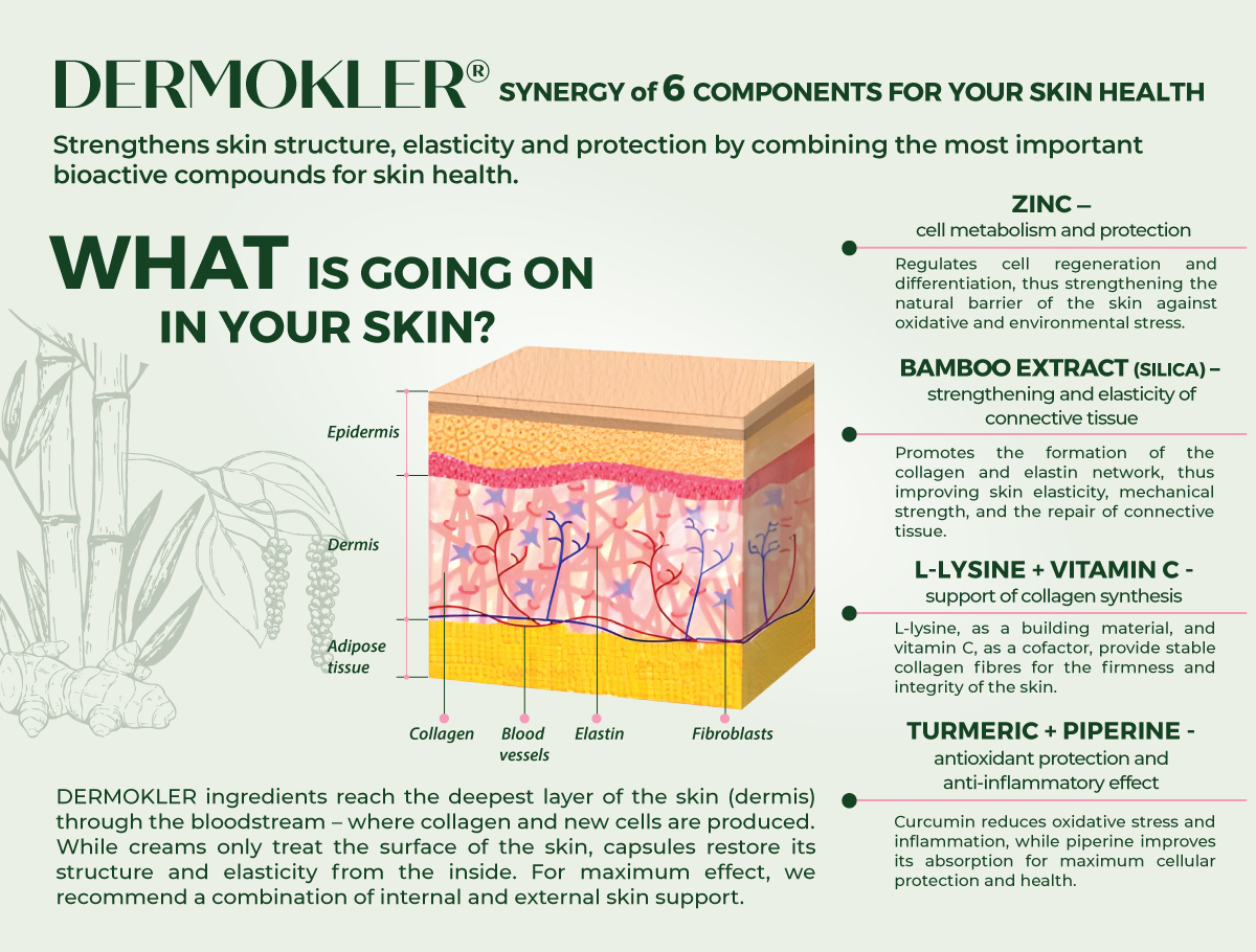 DERMOKLER is a food supplement for the support of skin health. When taken orally, the active ingredients enter the circulation and tissues (including the dermis), where they promote the synthesis of collagen, support connective tissue structure, reduce oxidative stress, and promote skin regeneration.