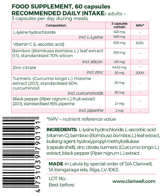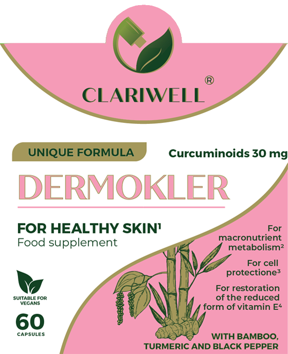 CLARIWELL® DERMOKLER unique formula with L-lysine, vitamin C, bamboo, zinc, turmeric and black pepper supports normal skin function: maintaining skin health, ensuring normal macronutrient metabolism, promoting normal protein synthesis and acid-base metabolism, as well as cell protection against oxidative stress. Helps restore the reduced form of vitamin E and promotes the normal production of collagen, which is essential for normal skin function.