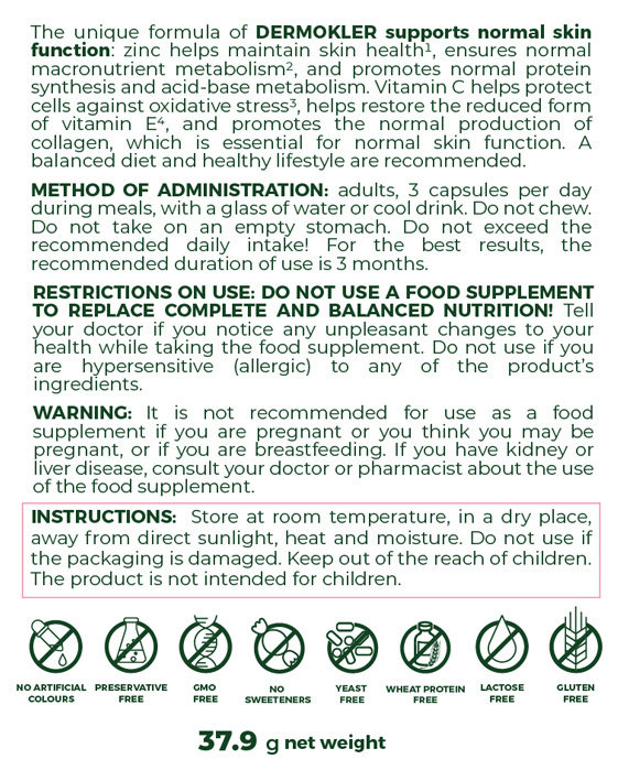 DERMOKLER contains 60 capsules, intended for 20 days.