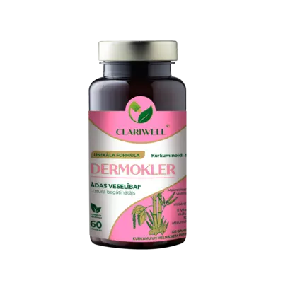 CLARIWELL® DERMOKLER unique formula with L-lysine, vitamin C, bamboo, zinc, turmeric and black pepper supports normal skin function: maintaining skin health, ensuring normal macronutrient metabolism, promoting normal protein synthesis and acid-base metabolism, as well as cell protection against oxidative stress. Helps restore the reduced form of vitamin E and promotes the normal production of collagen, which is essential for normal skin function.