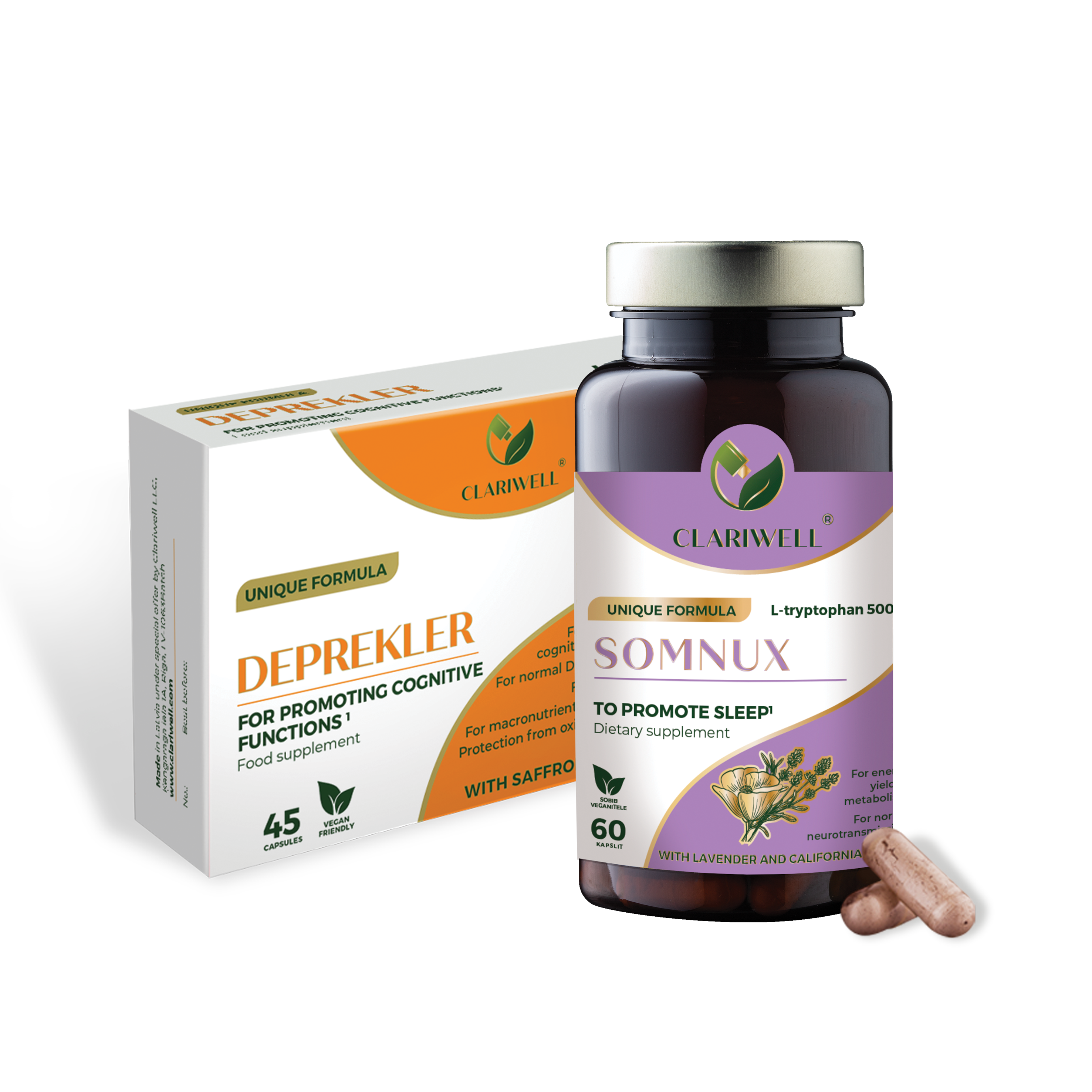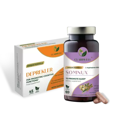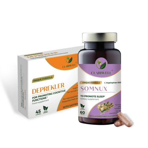 CLARIWELL® DEPREKLER and SOMNUX combine support for mood and sleep. DEPREKLER is more suitable for daytime support in periods of emotional strain, low mood, or reduced concentration, while SOMNUX helps you unwind in the evening, fall asleep more easily, and sleep more calmly. This combination is particularly useful when sleep problems are linked to long-term emotional overload