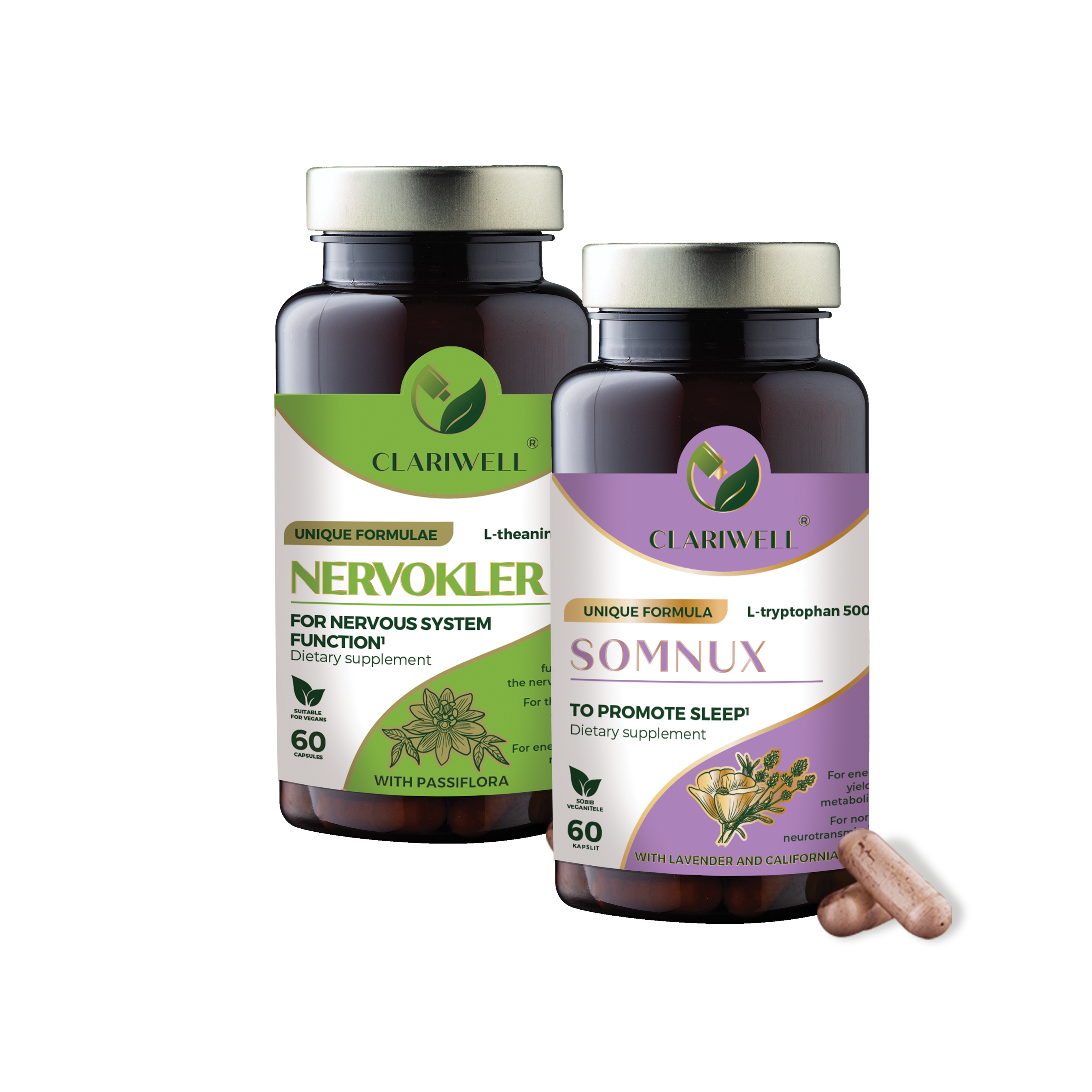 Take NERVOKLER 2 capsules daily — 1 capsule in the morning and 1 in the evening. Take SOMNUX 2 capsules once daily 30 minutes before bedtime. In practice, NERVOKLER is taken morning and evening, while SOMNUX is taken at bedtime. This helps reduce tension during the day and supports falling asleep in the evening.