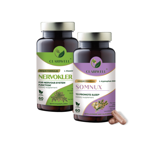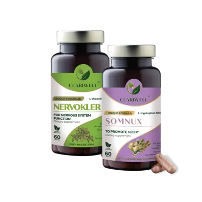 CLARIWELL® NERVOKLER and SOMNUX combine support for the nervous system and sleep. NERVOKLER helps reduce stress, tension, and nervous system overload, while SOMNUX helps you unwind in the evening and fall asleep more easily. This combination is well suited to situations where daytime stress also disrupts nighttime rest.