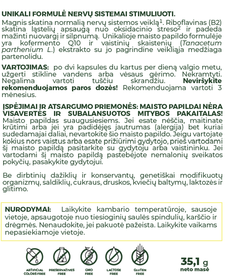 Ypatingos formulės CLARIWELL® MIGRAKLER maisto papildas su magniu, vaistiniais skaisteniais, kofermentu Q10 ir riboflavinu (vitaminu B2) palaiko normalią nervų sistemos veiklą.