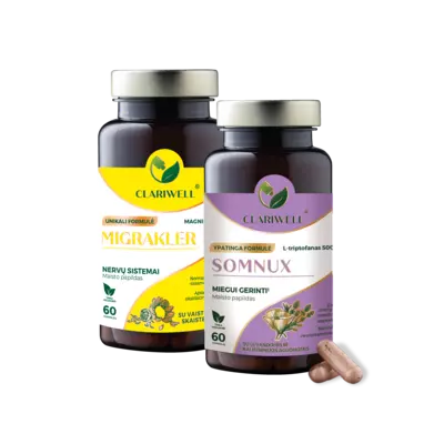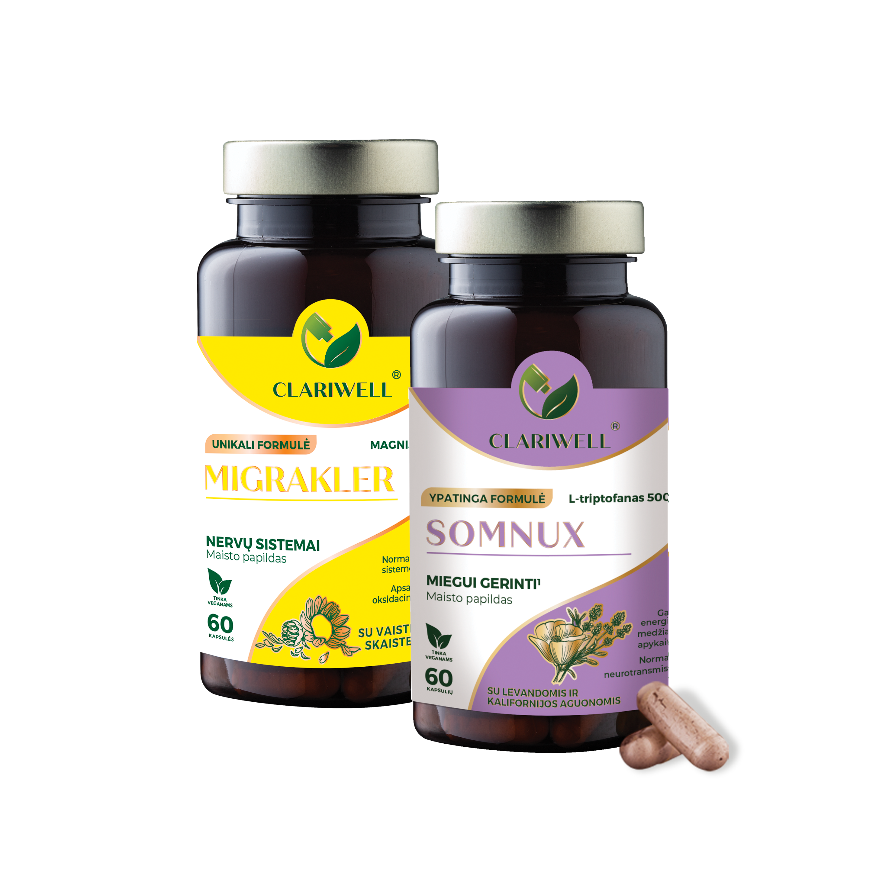 CLARIWELL® MIGRAKLER ir SOMNUX derina migrenos profilaktikos ir miego palaikymą. MIGRAKLER skirtas ilgesniam vartojimo kursui, padedant mažinti migrenos foną, o SOMNUX padeda lengviau užmigti ir miegoti ramiau. Ši kombinacija ypač naudinga, kai migrena paūmėja prasto miego fone.