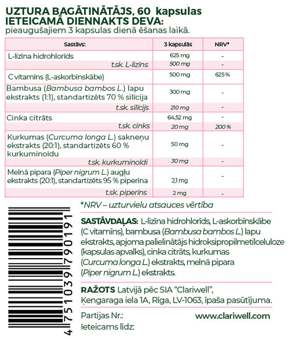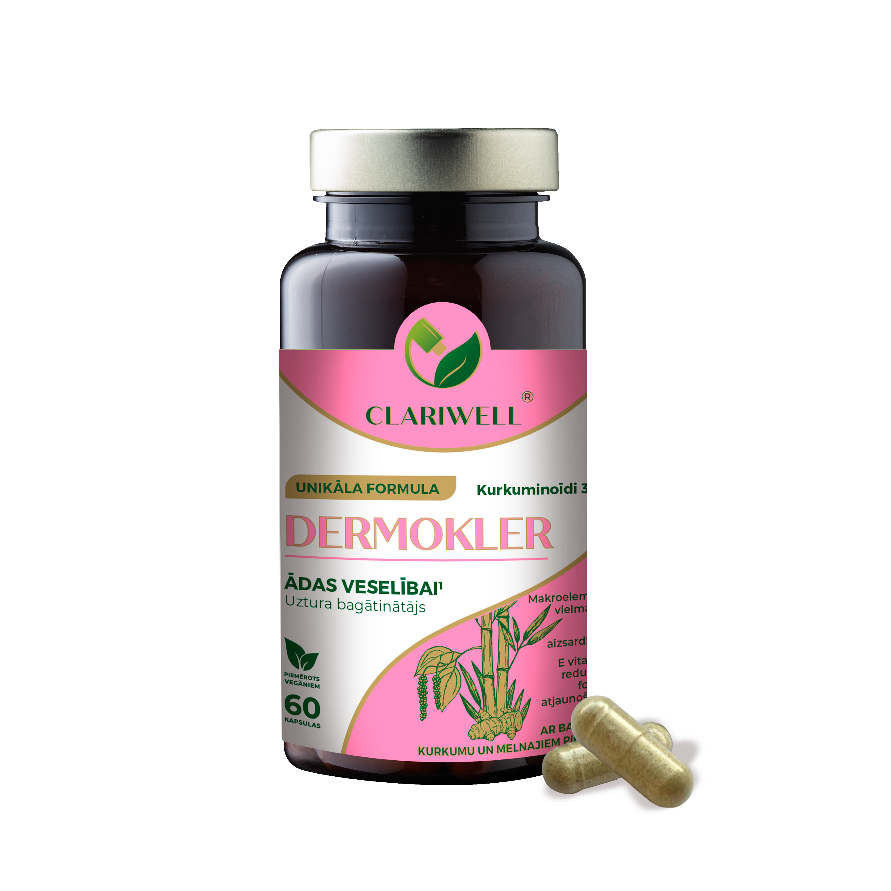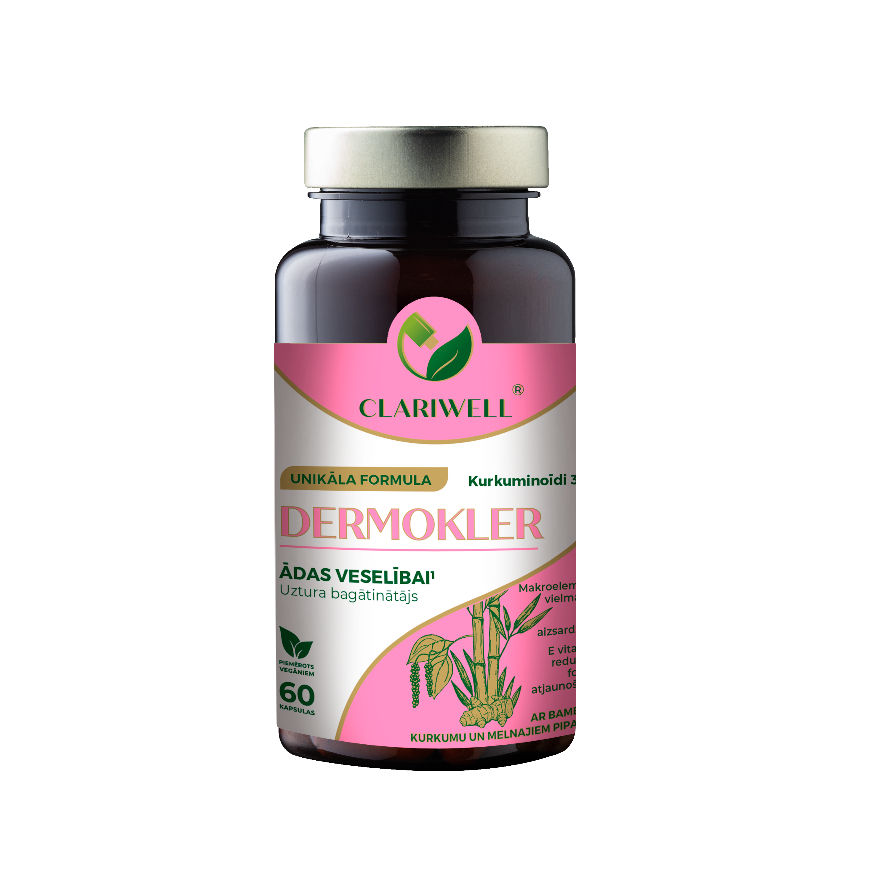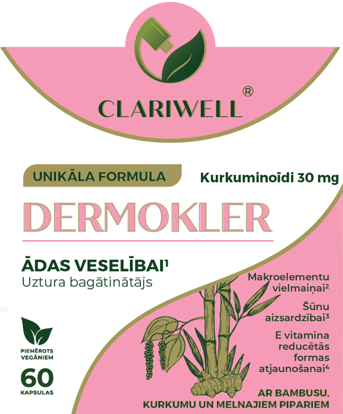 CLARIWELL® DERMOKLER unikālā formula ar L-lizīnu, C vitamīnu, bambusu, cinku, kurkumu un melnajiem pipariem palīdz normālai ādas darbībai: uzturēt ādas veselību, nodrošināt normālu makroelementu vielmaiņu, veicina normālu olbaltumvielu sintēzi un skābju un bāzu vielmaiņu, kā arī šūnu aizsardzību pret oksidatīvo stresu. Palīdz atjaunot E vitamīna reducēto formu un veicina normālu kolagēna veidošanos, kas nepieciešams normālai ādas darbībai.