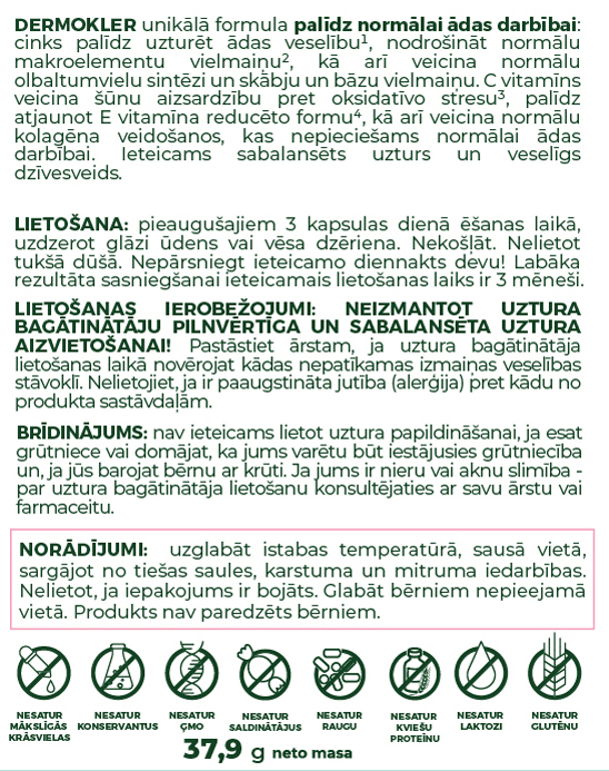 DERMOKLER vienā iepakojumā ir 60 kapsulas, kas paredzētas 20 dienām.