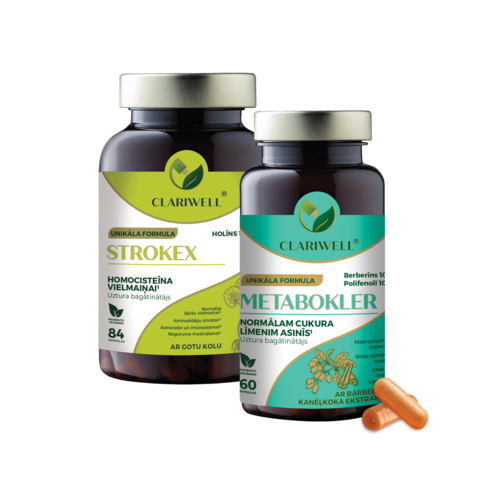 CLARIWELL® STROKEX un METABOKLER apvieno atbalstu asinsvadiem, vielmaiņai un cukura līmeņa līdzsvaram. STROKEX vairāk darbojas homocisteīna un asinsvadu veselības virzienā, savukārt METABOKLER palīdz uzturēt cukura līmeni un vielmaiņas līdzsvaru. Šī kombinācija ir īpaši noderīga, ja vairāki riska faktori pārklājas un nepieciešama plašāka pieeja.