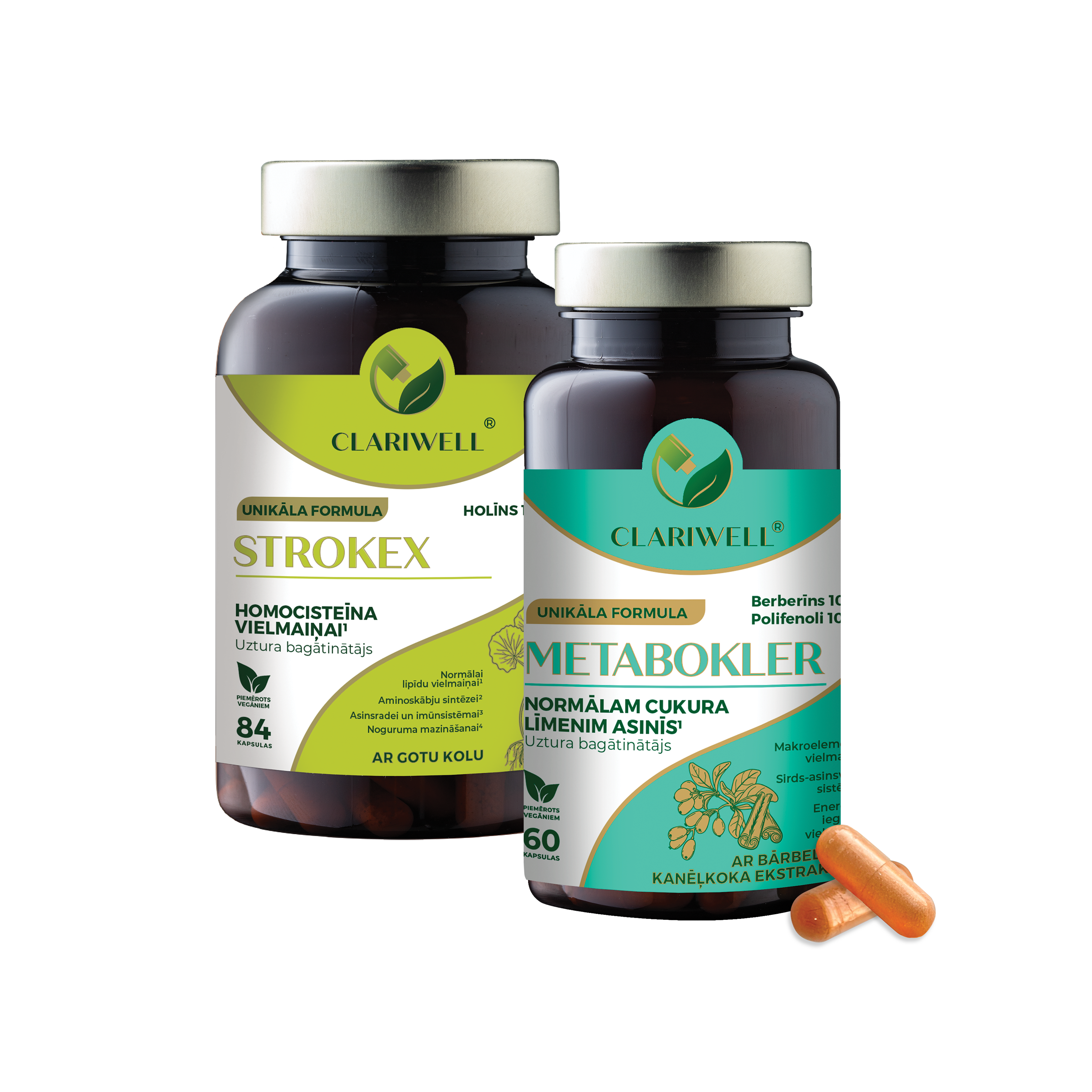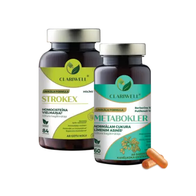 CLARIWELL® STROKEX un METABOKLER apvieno atbalstu asinsvadiem, vielmaiņai un cukura līmeņa līdzsvaram. STROKEX vairāk darbojas homocisteīna un asinsvadu veselības virzienā, savukārt METABOKLER palīdz uzturēt cukura līmeni un vielmaiņas līdzsvaru. Šī kombinācija ir īpaši noderīga, ja vairāki riska faktori pārklājas un nepieciešama plašāka pieeja.