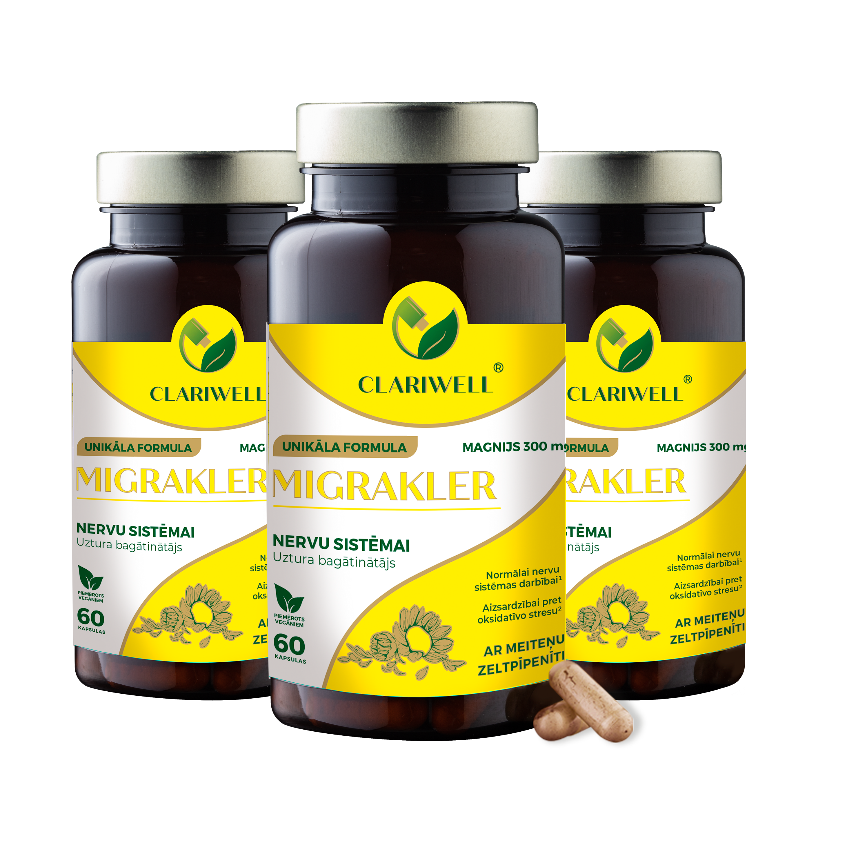 MIGRAKLER vienā iepakojumā ir 60 kapsulas, kas paredzētas 30 dienām. Labāka rezultāta sasniegšanai MIGRAKLER ieteicams lietot 3 mēnešus. NAV PAREDZĒTS TŪLĪTĒJAI SĀPJU NOVĒRŠANAI.