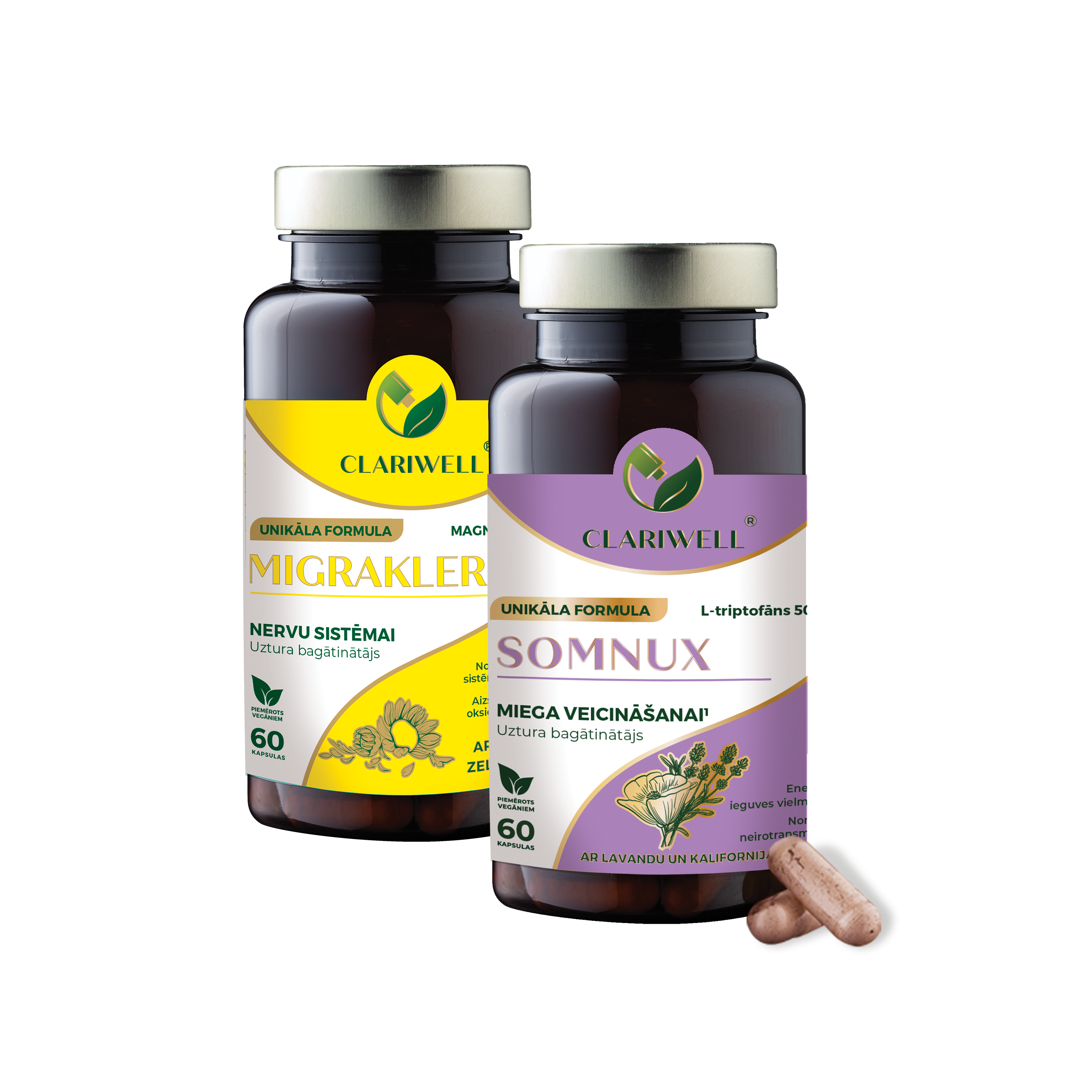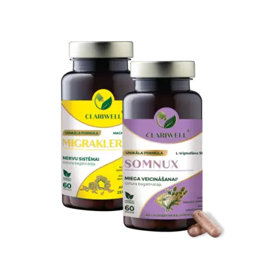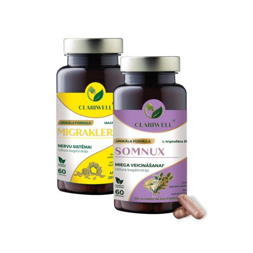 CLARIWELL® MIGRAKLER un SOMNUX apvieno atbalstu migrēnas profilaksei un miegam. MIGRAKLER paredzēts ilgākam lietošanas kursam, lai palīdzētu mazināt migrēnas fonu, savukārt SOMNUX palīdz vieglāk iemigt un gulēt mierīgāk. Šī kombinācija ir īpaši noderīga, ja migrēna saasinās uz slikta miega fona.
